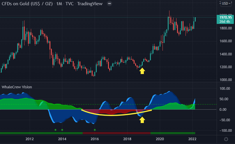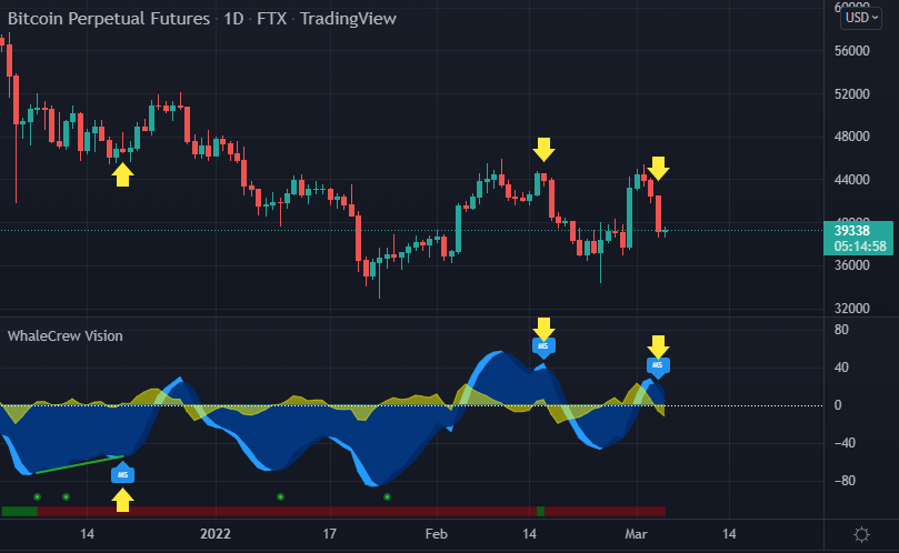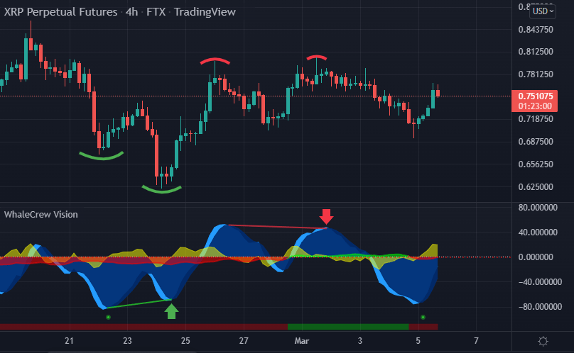 A momentum wave cross marks a potential momentum reversal. A bullish wave cross under oversold conditions leads to a big green dot which is a strong bullish indication.